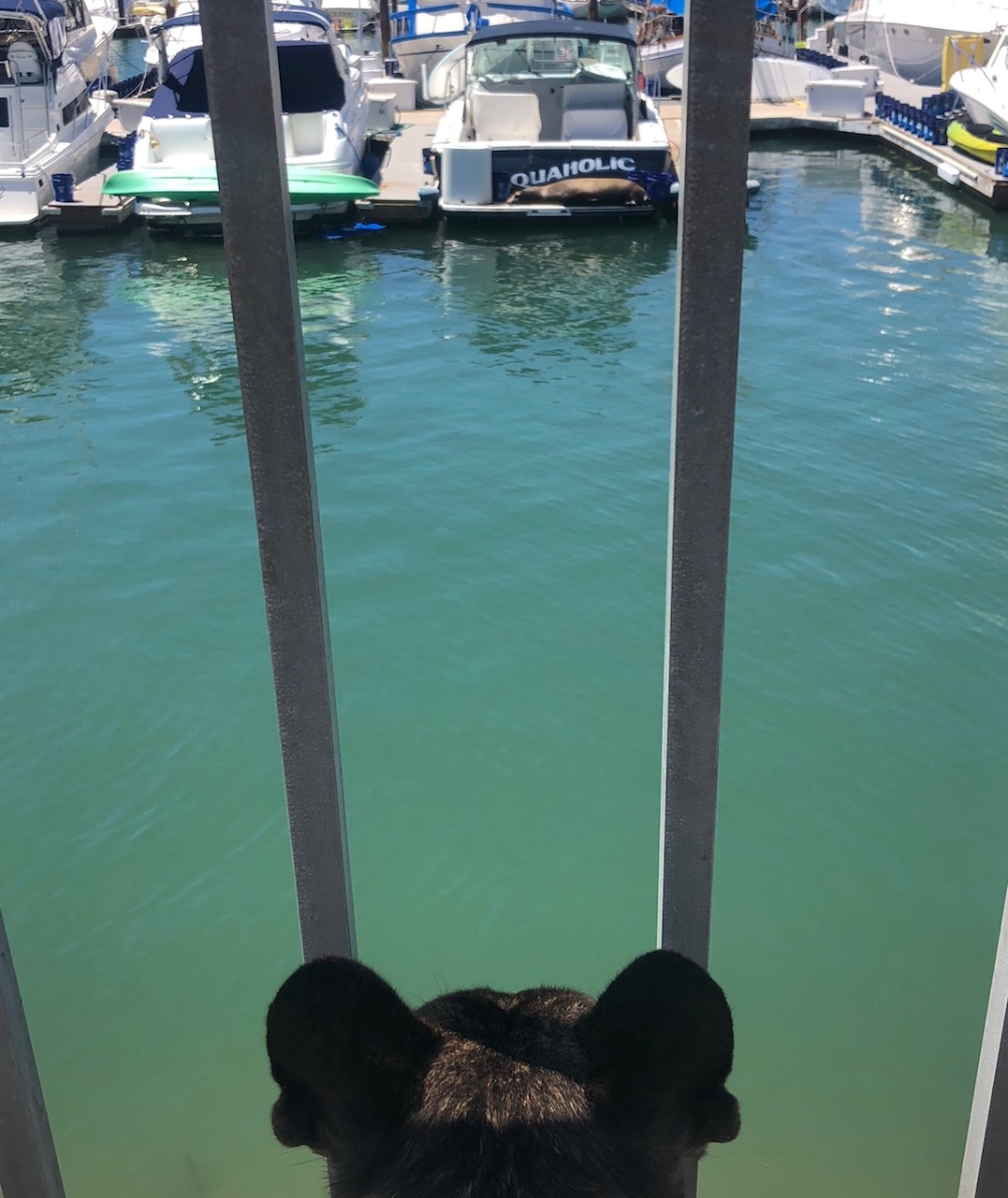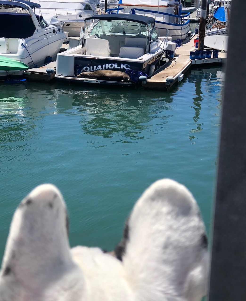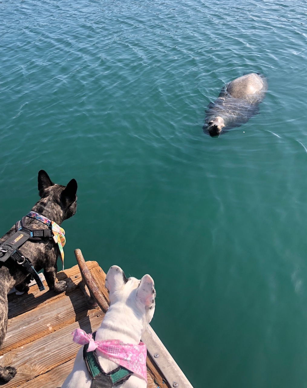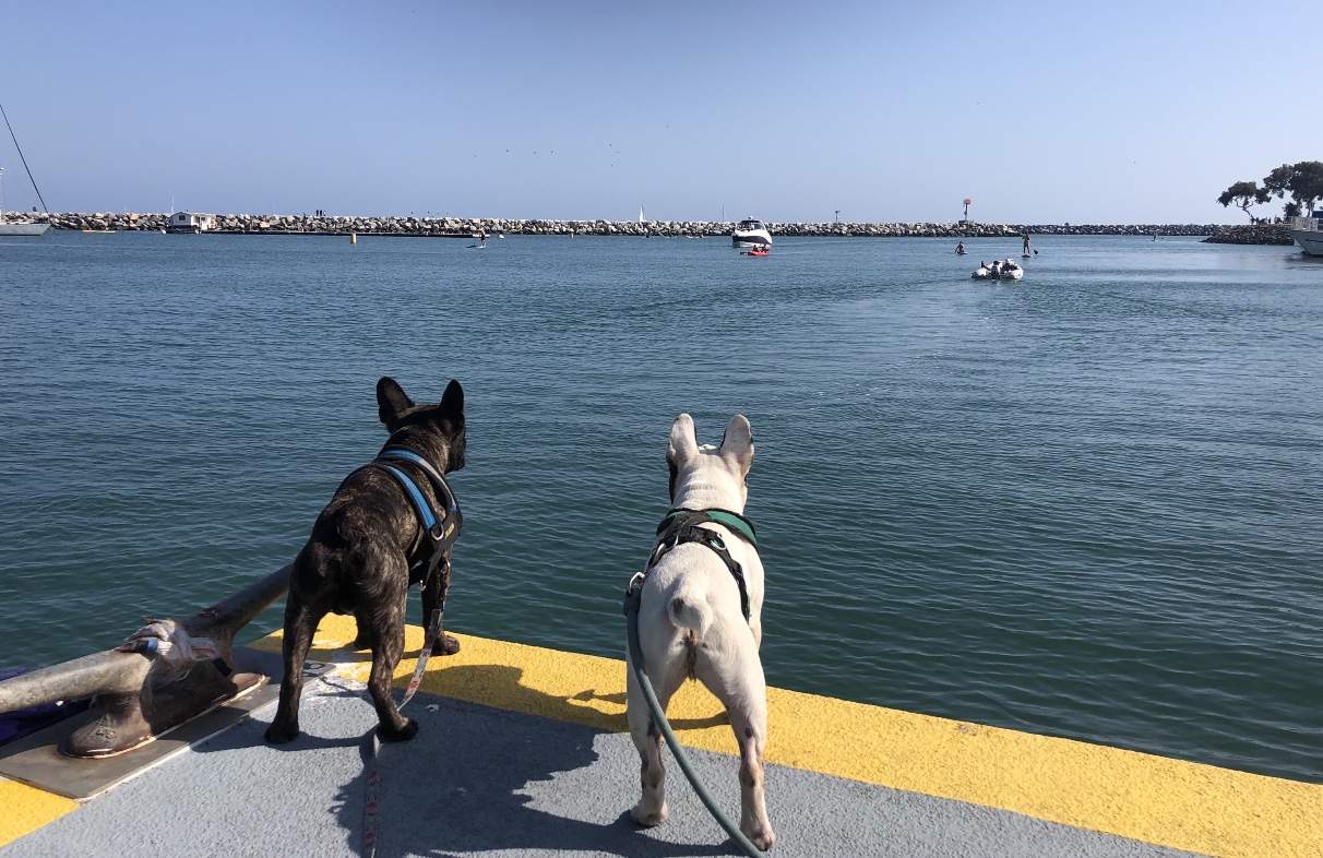 My mom said if she could make a bumper sticker it to put on back of cars, it would read ‘live like Eben.’ I am crazy. I am crazy for seals. One tried to kill me once…it drug me out to sea and my dad chased after it and pulled me back to shore while the seal tried pulling me back out with it into the wide open ocean. When my dad pulled me out of the water, my head was in the seals mouth. my mom ran up and pulled open the jaws of the seal and pulled my head out. True story. What are you crazy about? That even when it tries to kill you or hurts you or disappoints you, but you don’t give up on loving it? She says that’s one reason why she’d have a bumper sticker that reads ‘live like Eben’… I don’t need a sticker but I need Three Dog Bakery, and actual seals. My mom says that i love fiercely and that I’m the only one in her life that loves her more than she loves herself. I’m not sure why some humans think dogs are lesser than humans, when we actually love even harder sometimes than them. One of my doggy dog joys in life has been teaching my brother Lassen to become a seal hunter. I know if there was an add on google for ‘seal whispers’ we’d be the brothers for the job. There’s the Dana point harbor, the sacred place of seals that my mom takes us throughout the week. We have officially taught our dog friends to join in on the seal hunt and we all run down to the dock where the Catalina express boat is to look for them. It always feels like that song ‘Who let the dawgs out’ should be playing as we run down the dock. This Easter, something happened that was way better than a sea world show, a large seal hung out with us for 10 minutes while we stood on the dock and he stayed looking up at us even while i freaked out screaming my frenchie scream. He was determined to stay in the moment with me taking me in as i took him in. It was like my Make a Wish foundation dream came true.