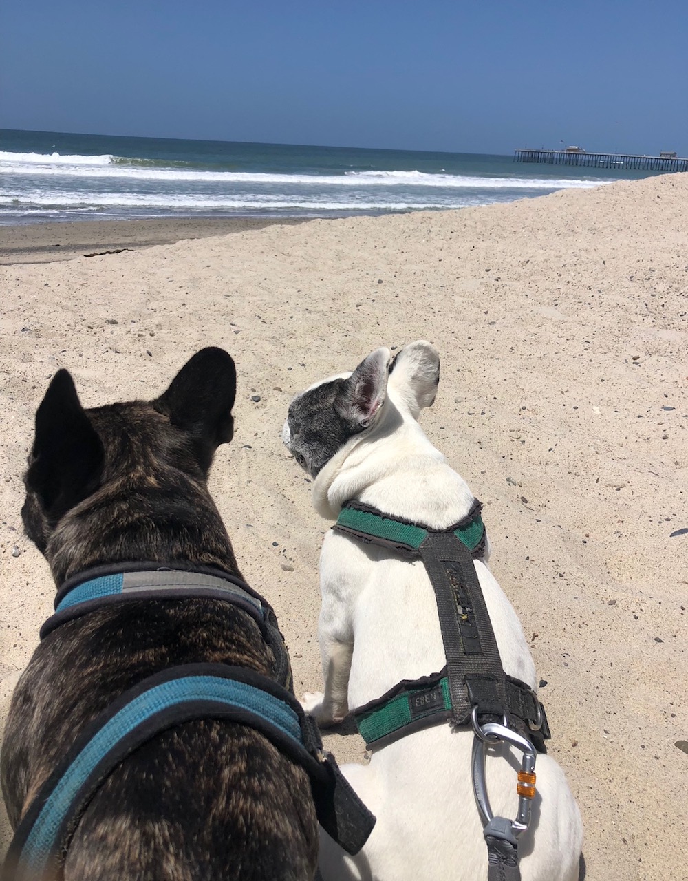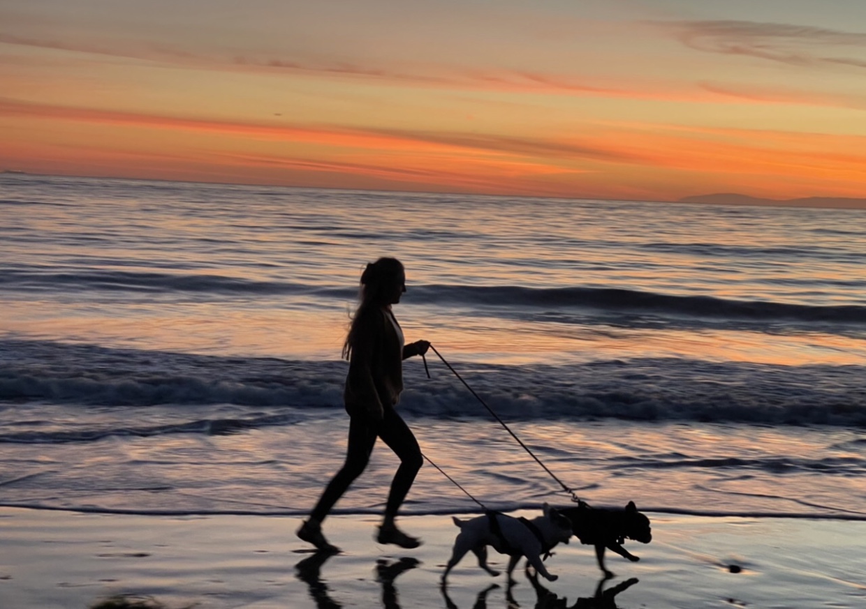 We walk our hood of San Clemente twice a day. The first walk, I dig my heels in and attempt to have us turn right to go to Three dog bakery, but she makes me turn left and walk to the beach trail. At least there’s seal rock nearby and get a chance to sit on the beach and smell the seals. The second walk is at night on the pier. No dogs are allowed on the pier, so my mom has been breaking bad and being a bad dog but I’m so glad because then I can go sniff for all the seals that are trying to get the fishermen’s catch. There’s a pack of fisherman that greet me most nights, when bro man Lassen and i walk onto the pier and they see us, one yells out every time “there’s the famous dogs!” On the way back from the pier, there’s a green patch where all the rabbits hang out at night. My mom and dad will hold onto our leashes while all 4 of us run like wild Comanches going ‘rabbit hunting.’ The rabbits scatter like their lives depended on it. Don’t worry, we don’t catch them, but I’m sure they get their cardio in most nights! Even when mom’s friends are walking with us they will partake in the ‘rabbit hunting’ and spectators can see a couple of grown women running seriously with their dogs like bats out of hell towards innocent Peter rabbits. Thanks Angie and Murphy for being a part of this. My mom once read a meme about this girl that ‘strapped her old pug into a baby stroller and then waited for the UPS truck to come. Then when the truck was in front of her house, she ran like a bat out of hell strolling the pug while it barked, just in case you want to know what love looks like’. There has been a few ‘sacred moments’ as Mom calls them (well not sacred to the rabbits), but on different occasions after I’ve had my cancer surgeries (and Lassen had hurt his paw from hiking), I wasn’t allowed to walk for a couple weeks so my parents stepped in for me. One night when I wasn’t allowed to walk due to surgery, mom and dad drove me and Lassen down the street the the green patch where the bunny rabbits were hanging out, hoping they’d get a break from their cardio. Dad picked up Lassen in his arms and mom placed me in her arms and then something special happened, like little kids they started running down the green patch. Yes, they were running towards the rabbits ‘chasing’ the rabbits while we were in our parents arms. This is not the first time they became our legs, just in case you forgot what love is. I know this is what it means to live in these precious days. This is my paradise now.